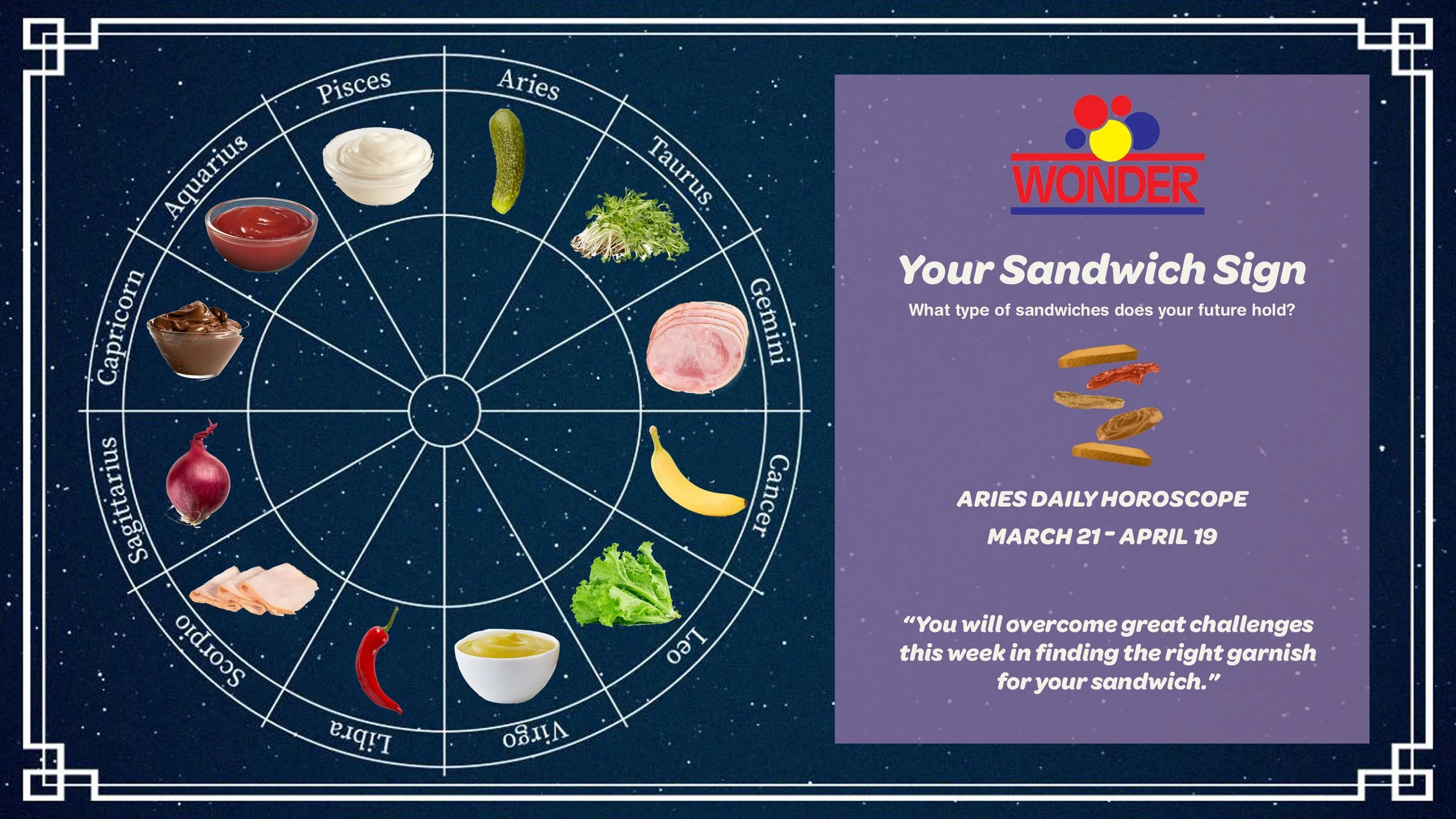 What type of sandwiches does your future hold? What ingredients will you find in your path? Let Wonder Bread know your wonders on social media and you will in turn learn your Sandwich Sign. It isn’t weird that you like ketchup and honey on a sandwich, you’re just a sauce dripping, white bread rising sign.
